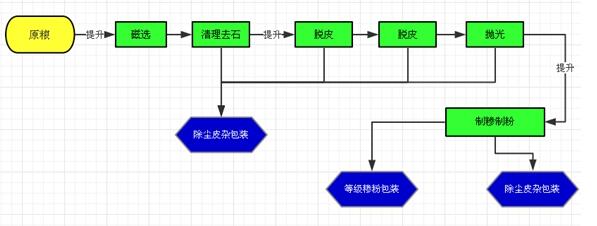 玉米經(jīng)過(guò)清理篩去除雜質(zhì)進(jìn)入潤(rùn)水提升機(jī),在潤(rùn)水提升機(jī)中使玉米加工表皮浸水濕潤(rùn)后進(jìn)入儲(chǔ)料箱,再進(jìn)入脫皮破碎機(jī),玉米脫皮破碎后經(jīng)錐篩提粉后進(jìn)入提胚機(jī)分離胚芽和皮,去皮去胚芽后的玉米糝進(jìn)入粉碎機(jī)磨粉后由接料器出料口流出。玉米—篩選—潤(rùn)水—脫皮—脫坯—篩分—提胚—玉米糝—磨粉—裝袋。